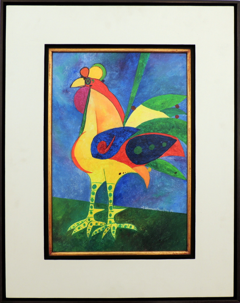 Aldemir Martins (Ingazeiras CE 1922 – São Paulo SP 2006). pintor, gravador, desenhista, ilustrador. Em 1941, participa da criação do Centro Cultural de Belas Artes, em Fortaleza, com Antonio Bandeira (1922-1967), Raimundo Cela (1890-1954), Inimá de Paula (1918-1999) e Mario Baratta (1915-1983), um espaço para exposições permanentes e cursos de arte. Três anos depois, a instituição passa a chamar-se Sociedade Cearense de Artes Plásticas – SCAP. Aldemir Martins produz desenhos, xilogravuras, aquarelas e pinturas. Atua também como ilustrador na imprensa cearense. Em 1945, viaja para o Rio de Janeiro, e, menos de um ano depois, muda-se para São Paulo, onde realiza sua primeira individual e retoma a carreira de ilustrador. Entre 1949 e 1951, frequenta os cursos do Museu de Arte de São Paulo Assis Chateaubriand – MASP e torna-se monitor da instituição. Estuda história da arte com Pietro Maria Bardi (1900-1999) e gravura com Poty Lazzarotto (1924-1998). Em 1959, recebe o prêmio de viagem ao exterior do Salão Nacional de Arte Moderna e permanece por dois anos na Itália. Desde o início da carreira sua produção é figurativa, e o artista emprega um repertório formal constantemente retomado: aves, sobretudo os galos; cangaceiros, inspirados nas figuras de cerâmica popular; gatos, realizados com linhas sinuosas; e ainda flores e frutas. Nas pinturas emprega cores intensas e contrastantes.