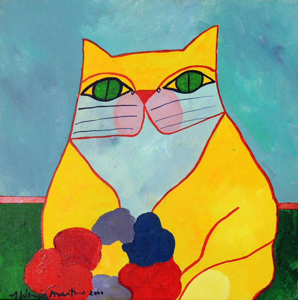 Aldemir Martins (Ingazeiras CE 1922 – São Paulo SP 2006). pintor, gravador, desenhista, ilustrador. Em 1941, participa da criação do Centro Cultural de Belas Artes, em Fortaleza, com Antonio Bandeira (1922-1967), Raimundo Cela (1890-1954), Inimá de Paula (1918-1999) e Mario Baratta (1915-1983), um espaço para exposições permanentes e cursos de arte. Três anos depois, a instituição passa a chamar-se Sociedade Cearense de Artes Plásticas – SCAP. Aldemir Martins produz desenhos, xilogravuras, aquarelas e pinturas. Atua também como ilustrador na imprensa cearense. Em 1945, viaja para o Rio de Janeiro, e, menos de um ano depois, muda-se para São Paulo, onde realiza sua primeira individual e retoma a carreira de ilustrador. Entre 1949 e 1951, frequenta os cursos do Museu de Arte de São Paulo Assis Chateaubriand – MASP e torna-se monitor da instituição. Estuda história da arte com Pietro Maria Bardi (1900-1999) e gravura com Poty Lazzarotto (1924-1998). Em 1959, recebe o prêmio de viagem ao exterior do Salão Nacional de Arte Moderna e permanece por dois anos na Itália. Desde o início da carreira sua produção é figurativa, e o artista emprega um repertório formal constantemente retomado: aves, sobretudo os galos; cangaceiros, inspirados nas figuras de cerâmica popular; gatos, realizados com linhas sinuosas; e ainda flores e frutas. Nas pinturas emprega cores intensas e contrastantes.